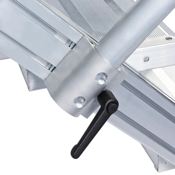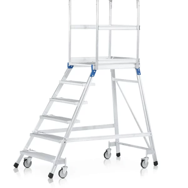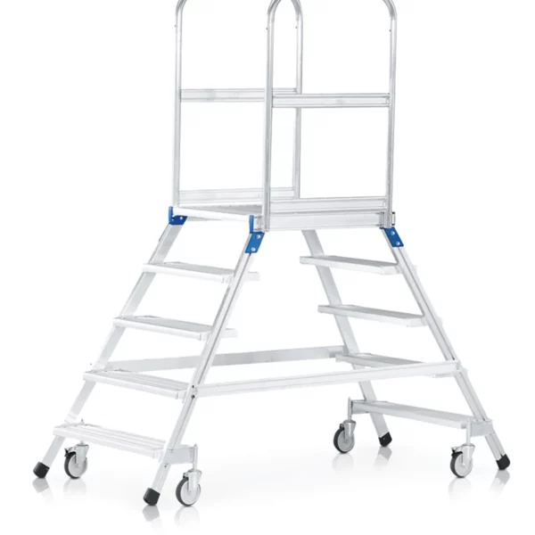 Két oldalon járható gurulós dobogós lépcső könnyűfém, vagy acélrácsos lépcsőfokokkal és dobogóval