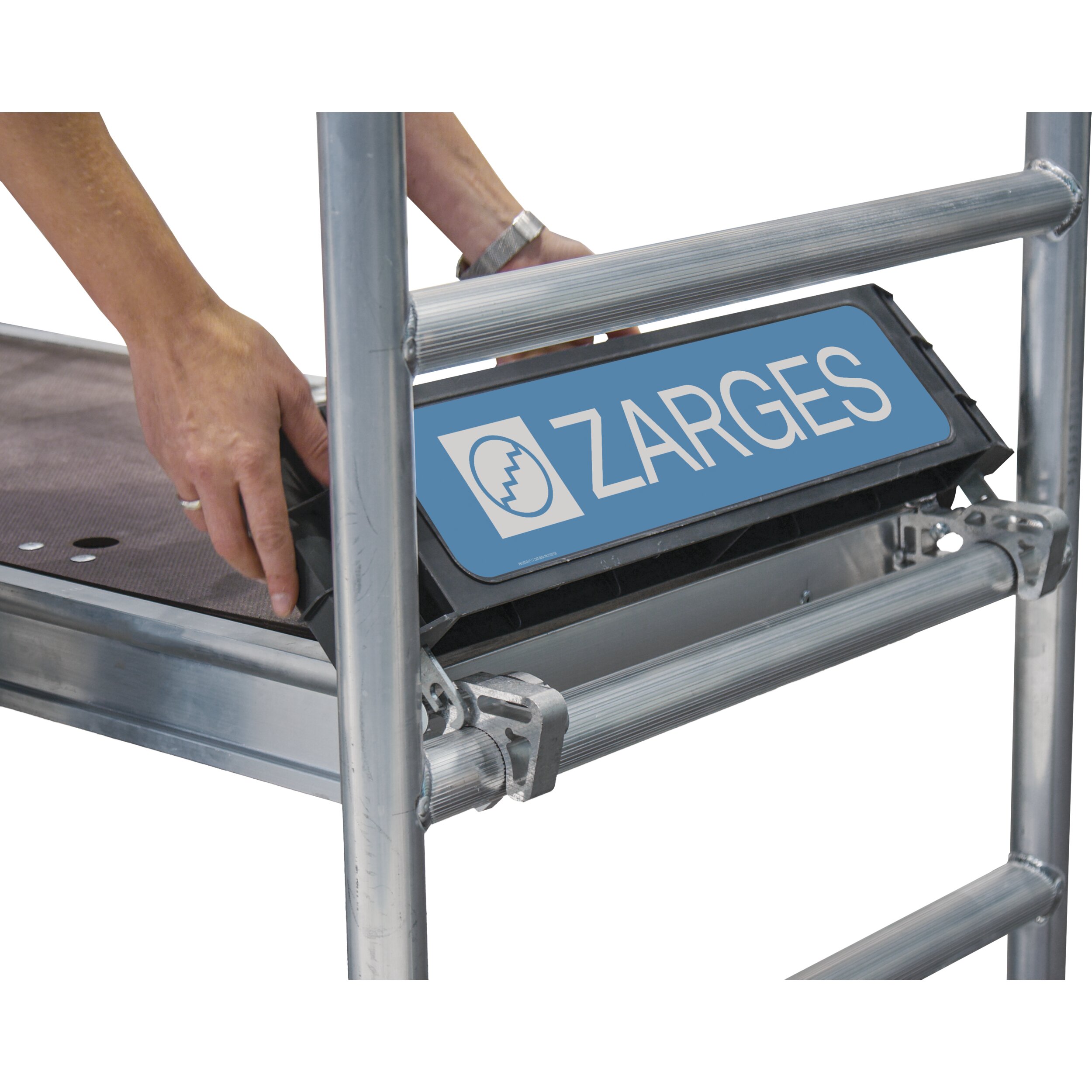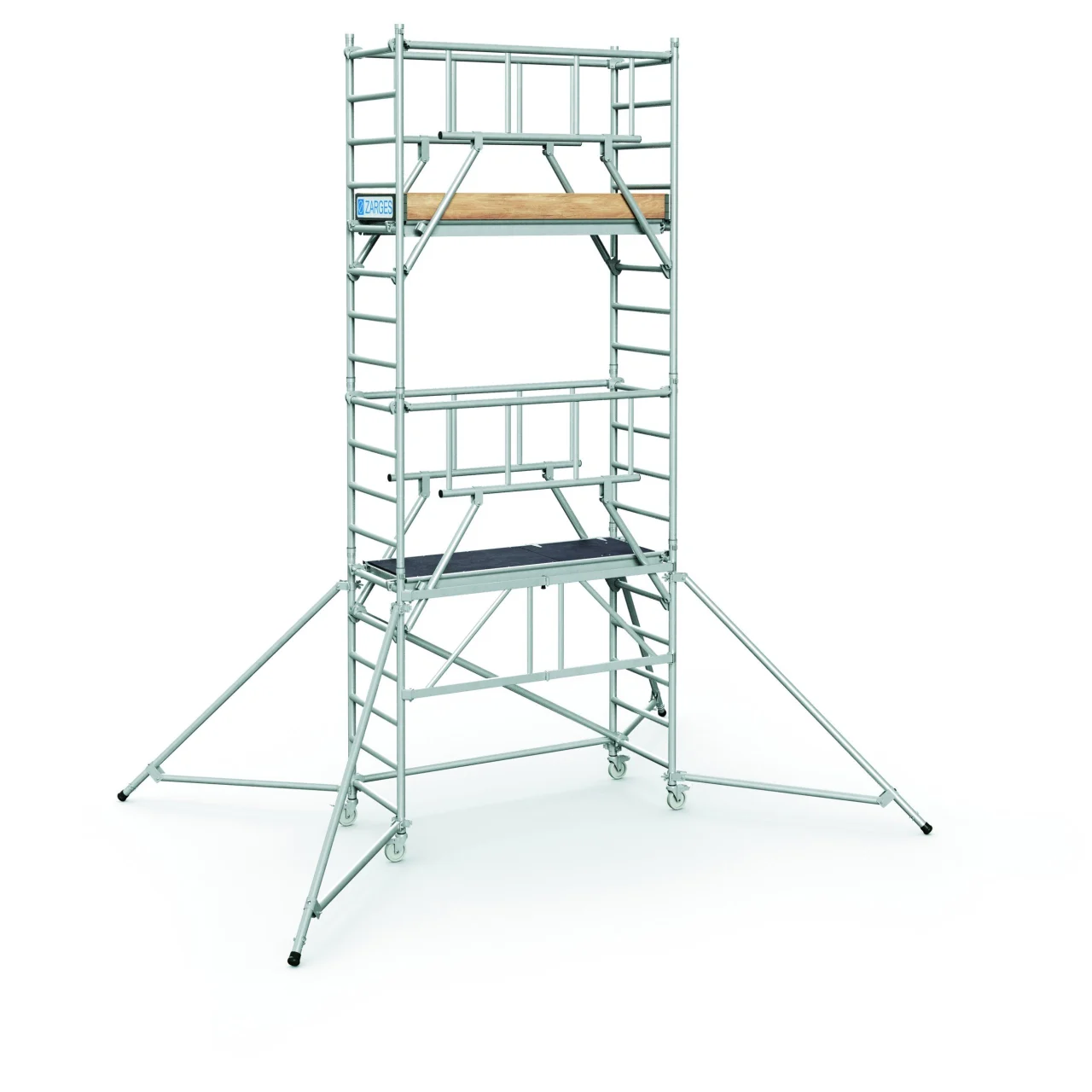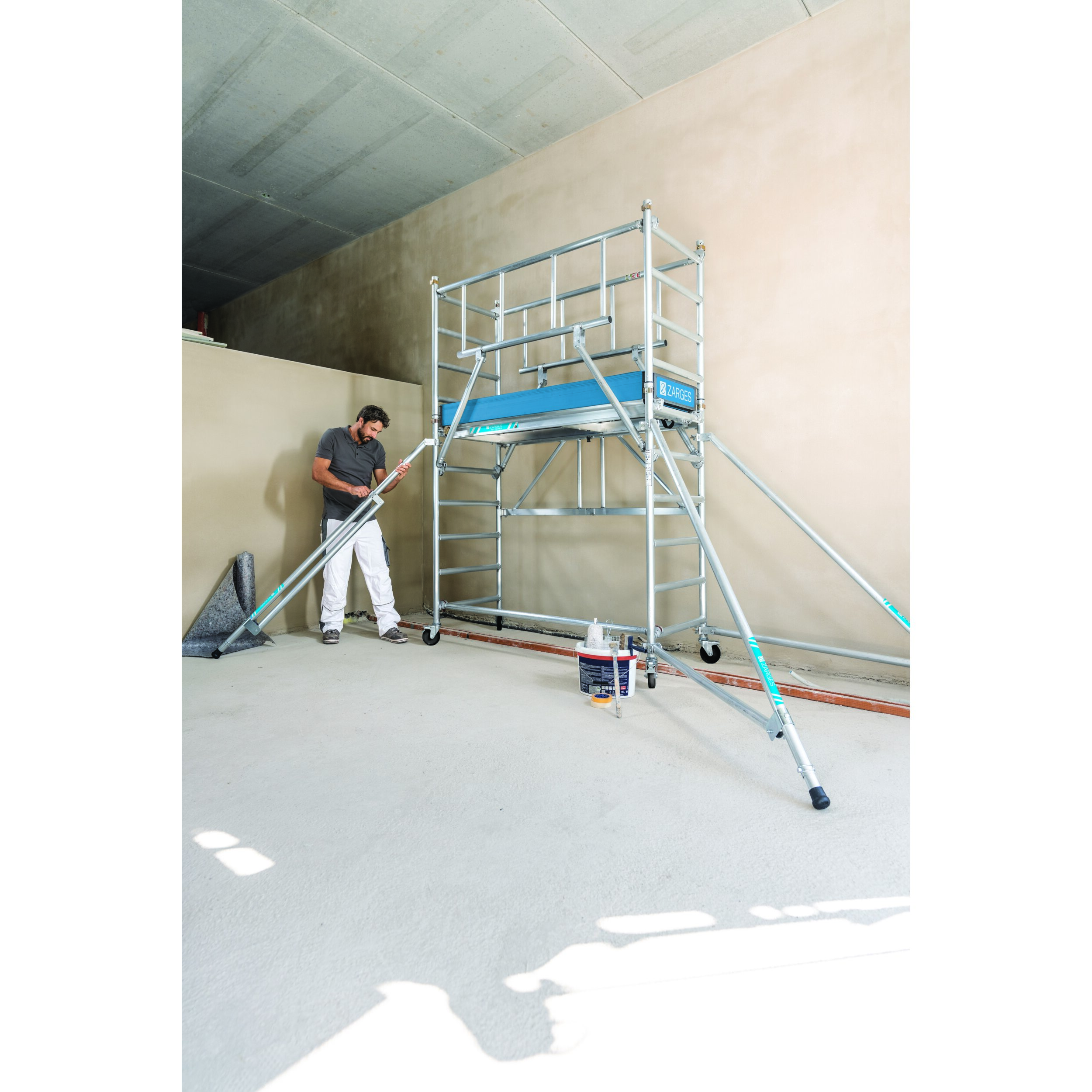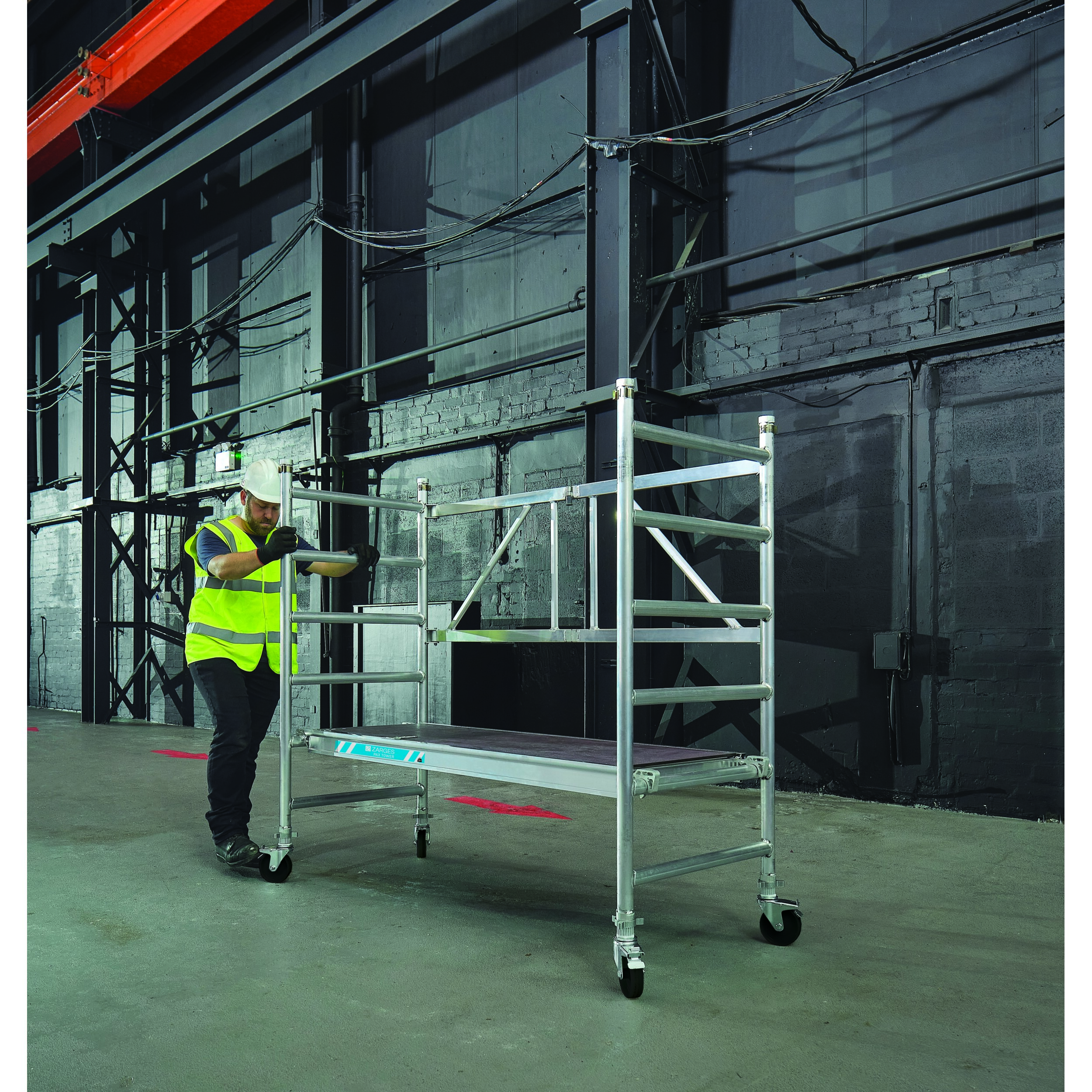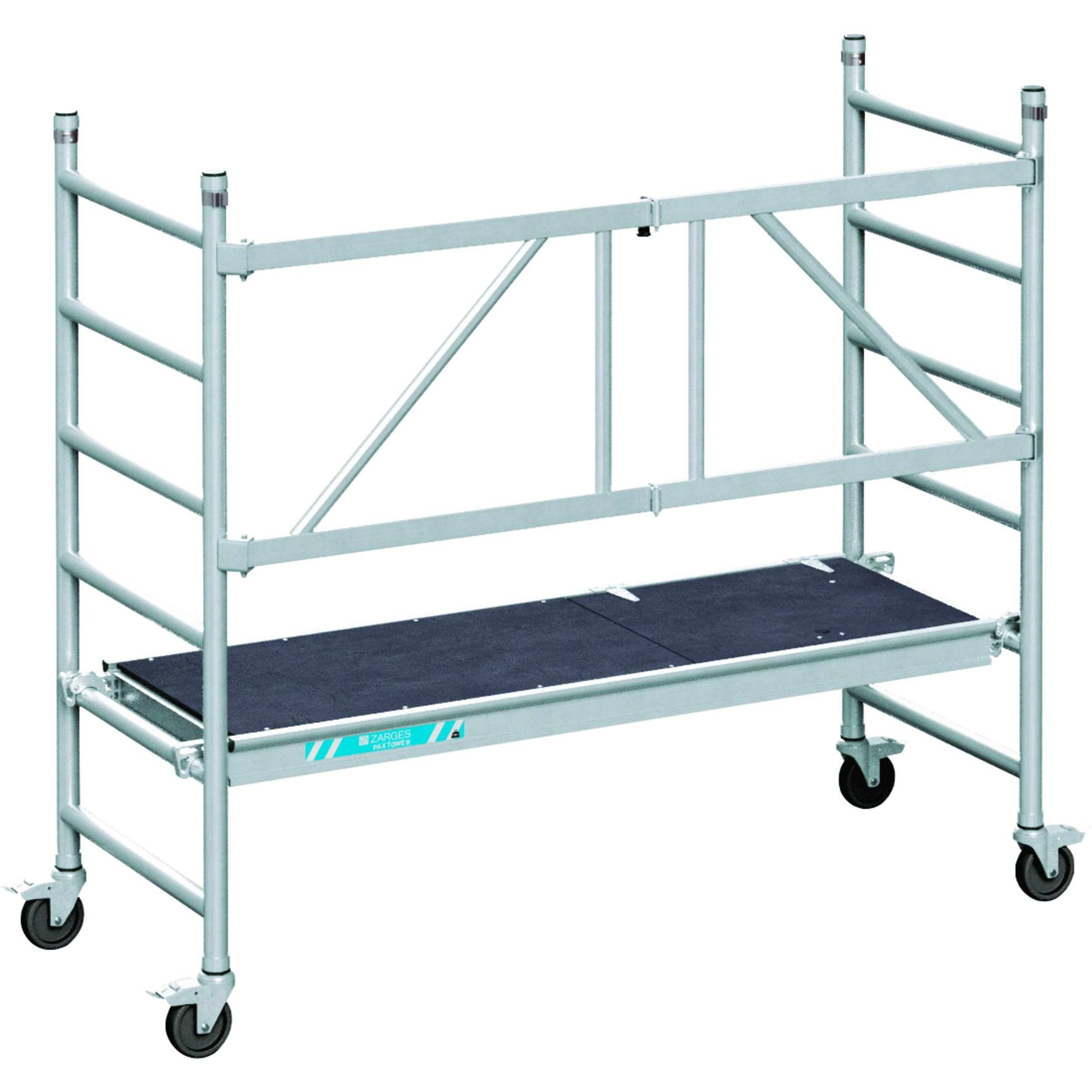 Az összecsukható keret a robusztus reteszelőgombjával könnyen kezelhető fél kézzel: rögzítés és kiengedés egyetlen kattintással. Könnyen mozgó illesztések kemény műanyagból: a függőleges keretek egymásba illesztésekor nem akadnak egymásba. Állványhossz: 1,80 m; Állványszélesség: 0,72 m. Az új EN 1004 szabvány szerint; 3-as osztályba sorolt (max. terhelhetőség 200kg/m²). 125 mm-es önbeálló kerekek rögzítőfékkel, amelyek kerékadapterrel (rendelési sz. 42974) orsózható kerekekké alakíthatók. Szár- és fokátmérő: 45 mm.