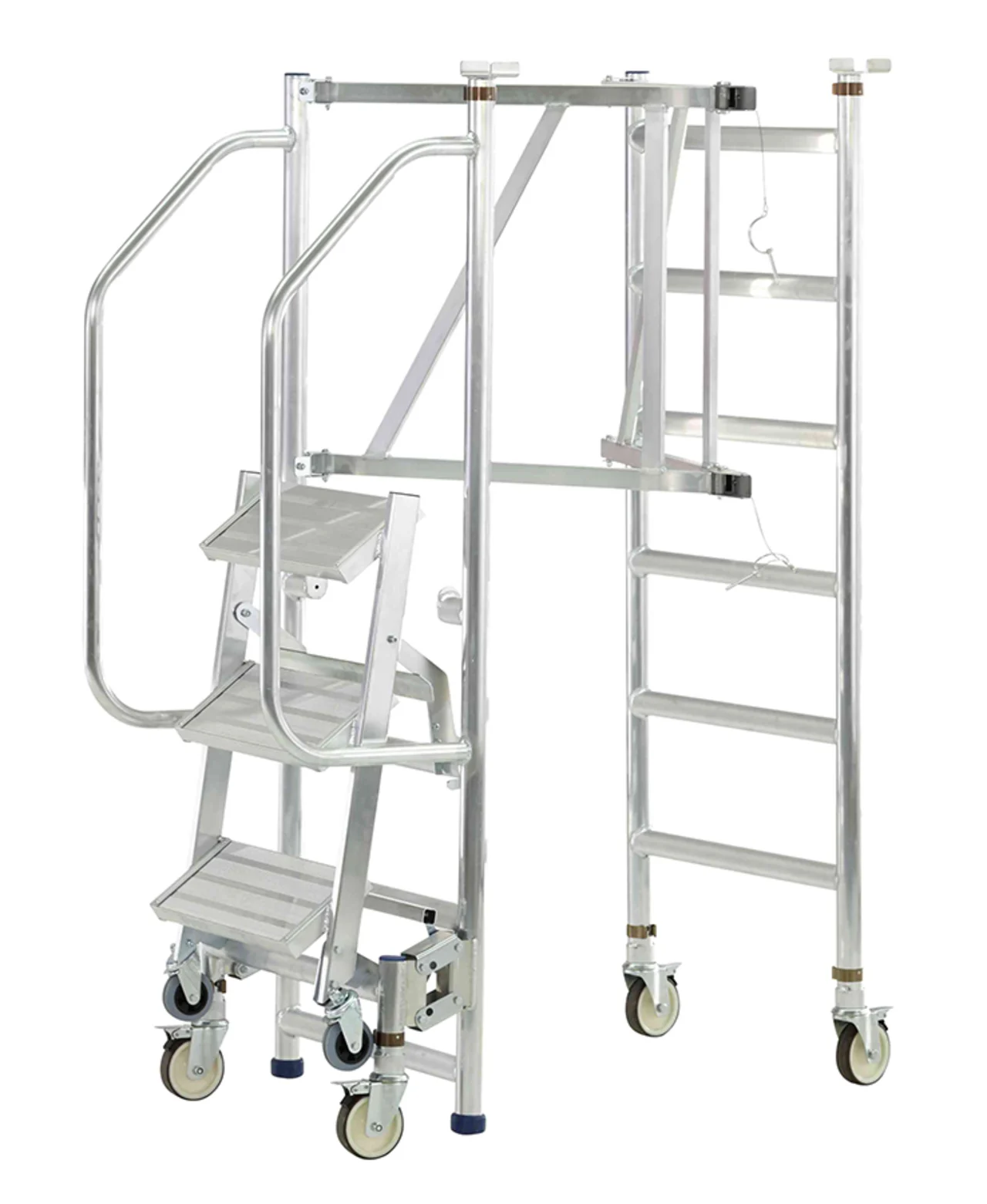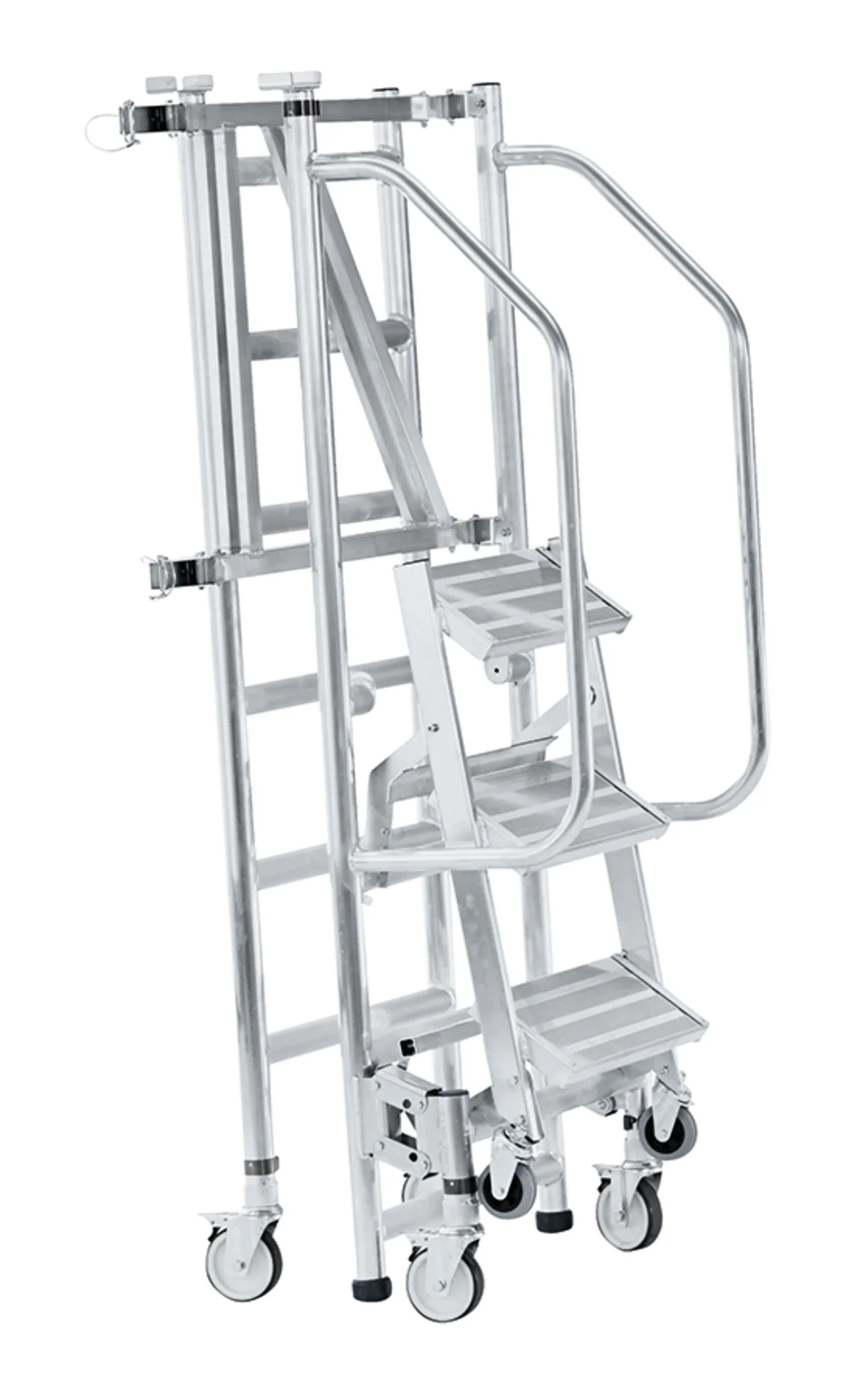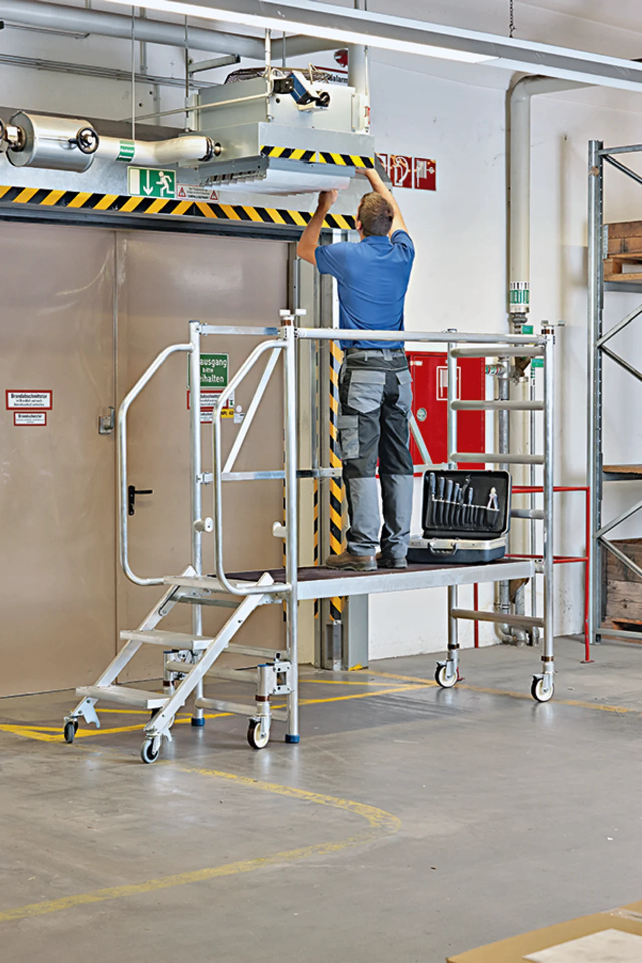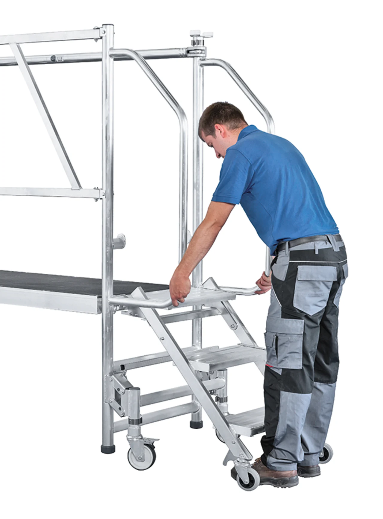Felhajtható lépcsők 200 mm mély fokkal a kényelmes és biztonságos felmászáshoz. Nagyon gyorsan és kényelmesen eltolható a mászórészen levő négy önbeálló keréken és a támasztórészen levő két fix keréken. Nagyon gyorsan alkalmazható a fellépési oldalon levő központi fék révén. Ajtón keresztül átvihető felépített állapotban is. Rugalmasan alkalmazható a három különböző dobogómagasság és csak egy munkadobogó révén. Kétoldali kapaszkodó a fellépési oldalon és dobogókorlát a maximális munkabiztonsághoz. Az összecsukható keretnek és a felhajtható lépcsőknek köszönhetően helytakarékosan összecsukható a szállításhoz és a tároláshoz. Nagyfelületű munkadobogó 1800 x 600 mm. Bevizsgált a BGR 173 szerint – összterhelés 200 kg.