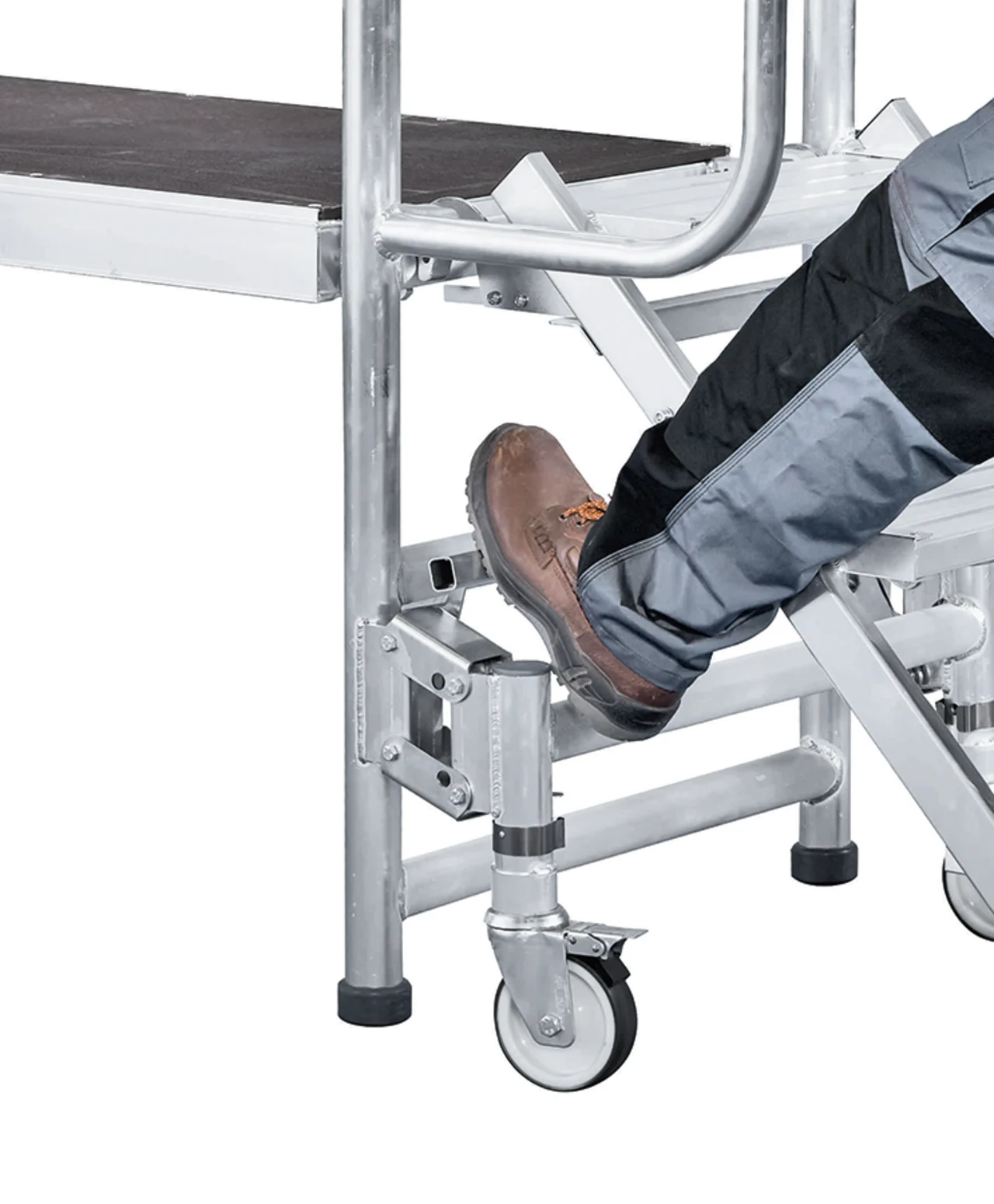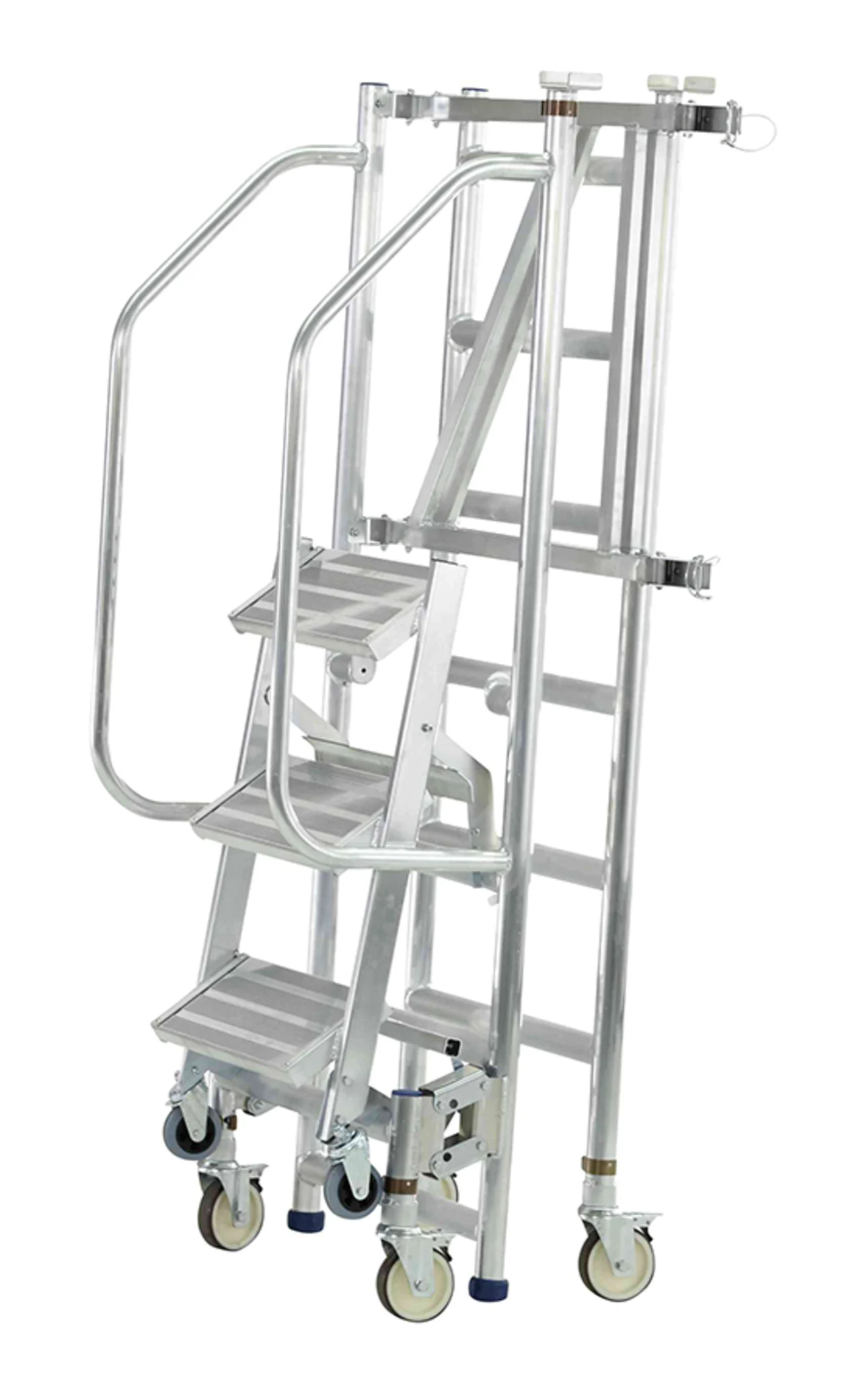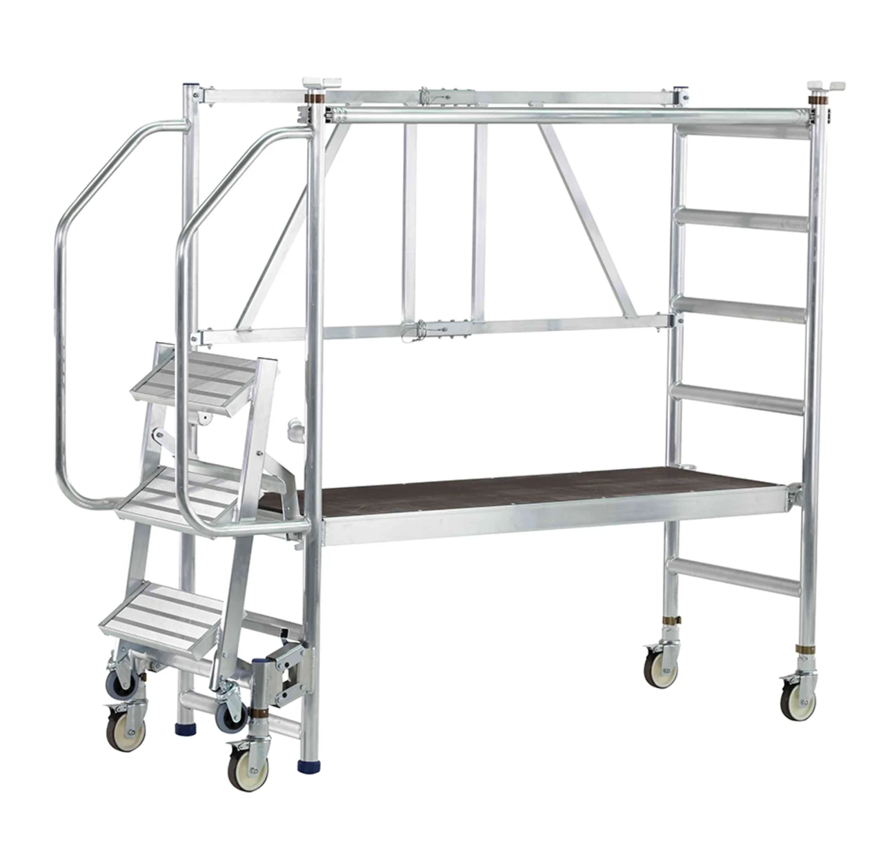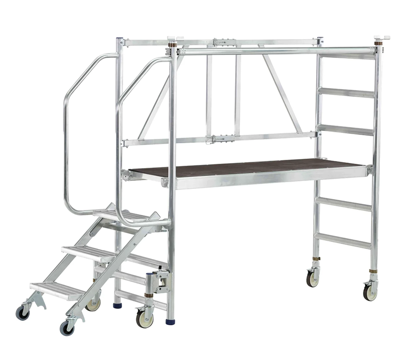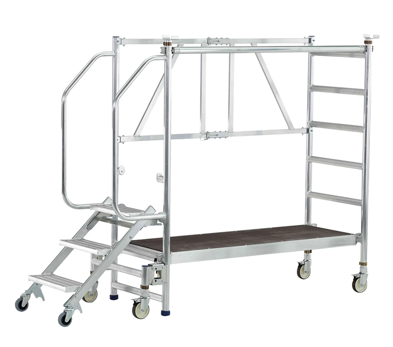 Felhajtható lépcsők 200 mm mély fokkal a kényelmes és biztonságos felmászáshoz. Nagyon gyorsan és kényelmesen eltolható a mászórészen levő négy önbeálló keréken és a támasztórészen levő két fix keréken. Nagyon gyorsan alkalmazható a fellépési oldalon levő központi fék révén. Ajtón keresztül átvihető felépített állapotban is. Rugalmasan alkalmazható a három különböző dobogómagasság és csak egy munkadobogó révén. Kétoldali kapaszkodó a fellépési oldalon és dobogókorlát a maximális munkabiztonsághoz. Az összecsukható keretnek és a felhajtható lépcsőknek köszönhetően helytakarékosan összecsukható a szállításhoz és a tároláshoz. Nagyfelületű munkadobogó 1800 x 600 mm. Bevizsgált a BGR 173 szerint – összterhelés 200 kg.