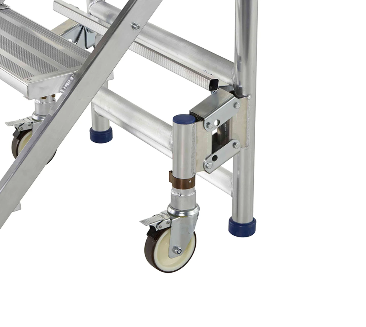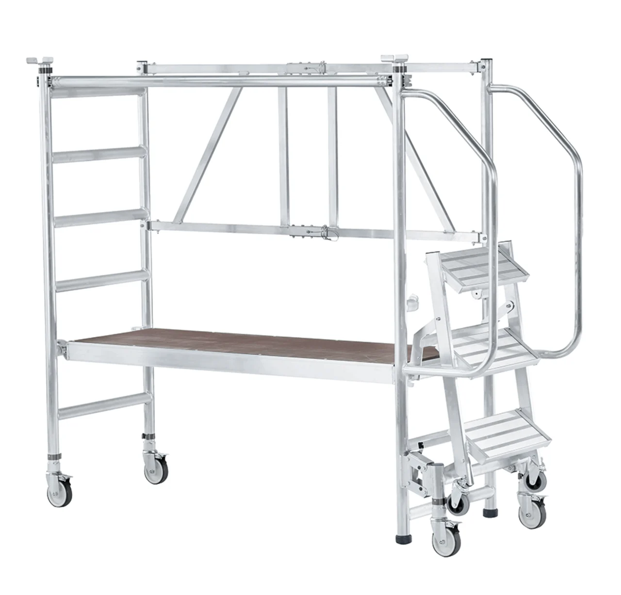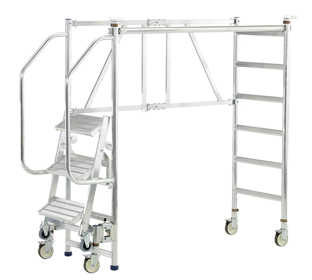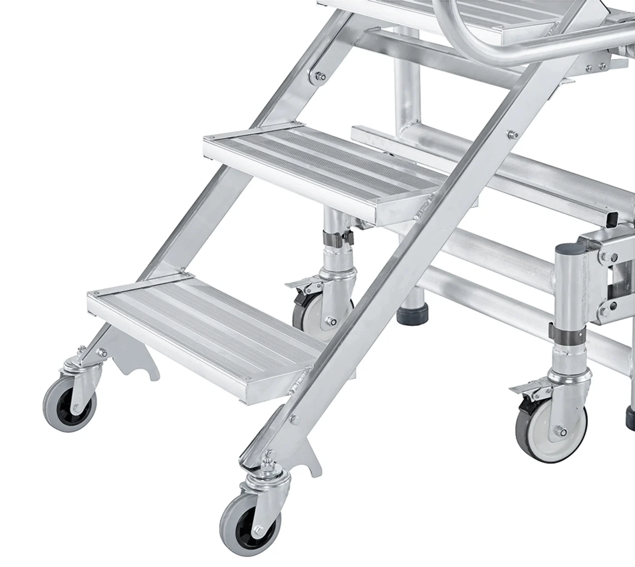Felhajtható lépcsők 200 mm mély fokkal a kényelmes és biztonságos felmászáshoz. Nagyon gyorsan és kényelmesen eltolható a mászórészen levő négy önbeálló keréken és a támasztórészen levő két fix keréken. Nagyon gyorsan alkalmazható a fellépési oldalon levő központi fék révén. Ajtón keresztül átvihető felépített állapotban is. Rugalmasan alkalmazható a három különböző dobogómagasság és csak egy munkadobogó révén. Kétoldali kapaszkodó a fellépési oldalon és dobogókorlát a maximális munkabiztonsághoz. Az összecsukható keretnek és a felhajtható lépcsőknek köszönhetően helytakarékosan összecsukható a szállításhoz és a tároláshoz. Nagyfelületű munkadobogó 1800 x 600 mm. Bevizsgált a BGR 173 szerint – összterhelés 200 kg.